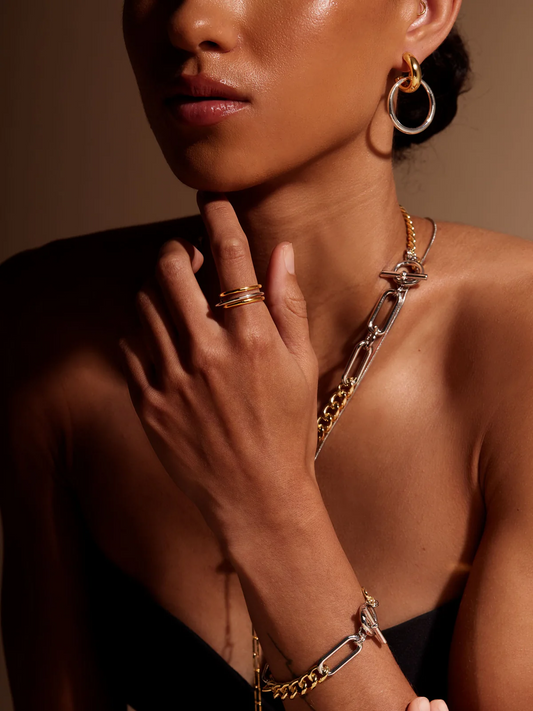 Complete your look with our collection of bold, beautiful bracelets designed to make a statement or add a subtle touch of sophistication. From chunky mixed-metal chains to polished cuffs and stretch pearl stacks, each piece is crafted with style, comfort, and quality in mind. Whether you’re stacking for impact or wearing a standout piece solo, these bracelets are triple-plated, hypoallergenic, and made to shine—day or night.