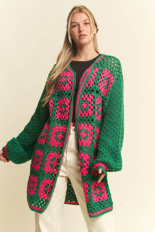 Two-Tone Floral Square Crochet Open Knit Cardigan: GREEN/PINK