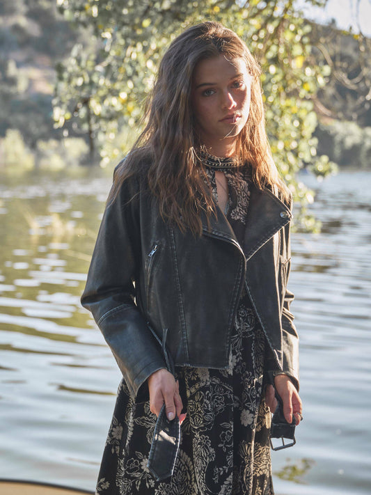 Washed Leather Moto Jacket: WASHED BLACK / S