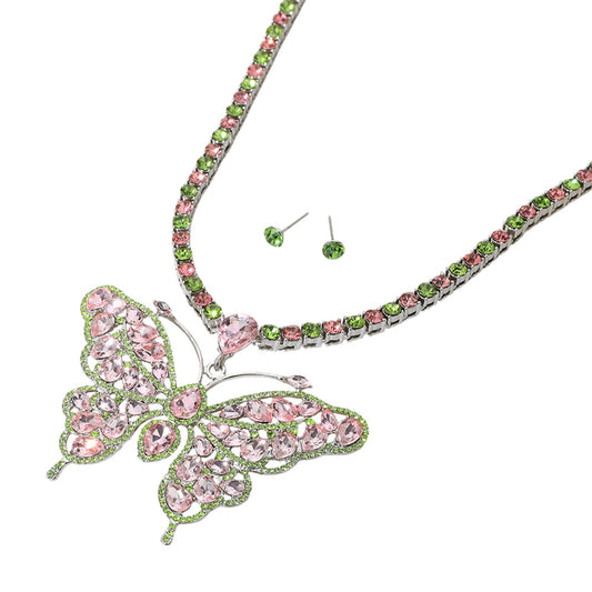 Butterfly Pendant Necklace Set in Pink & Green Stone
